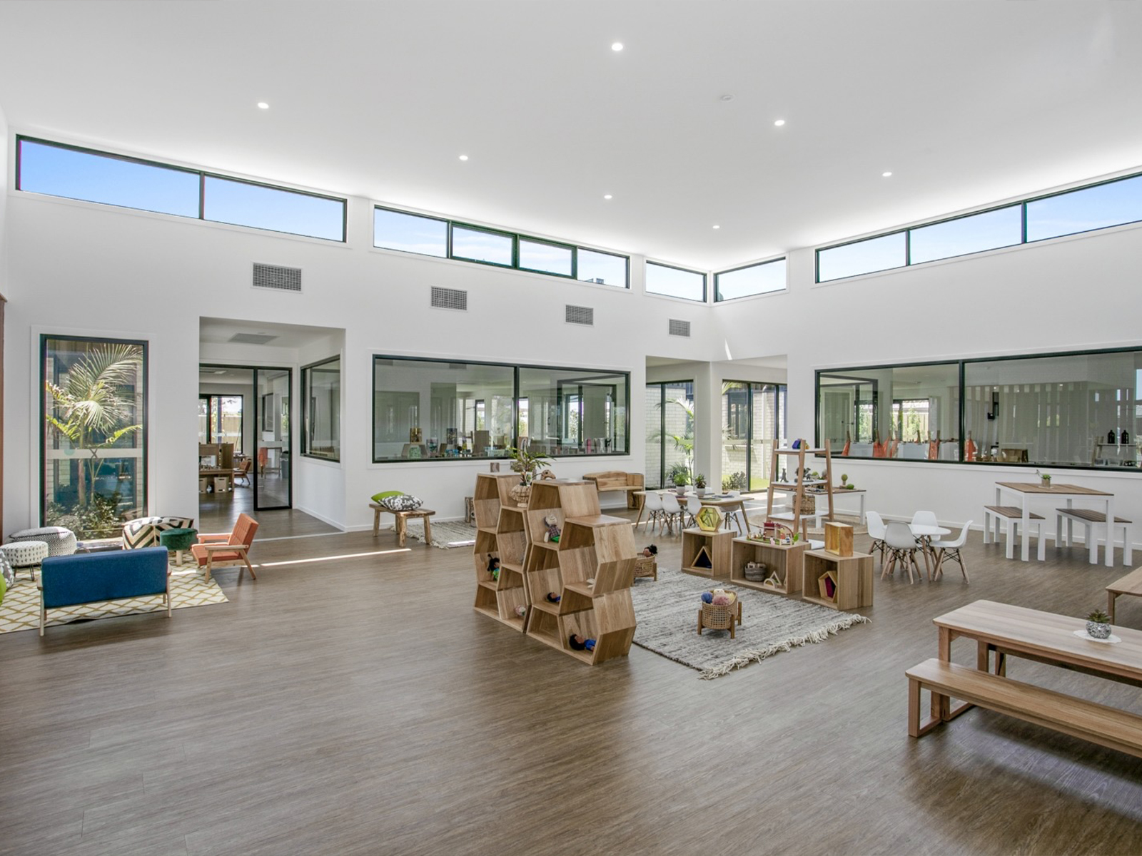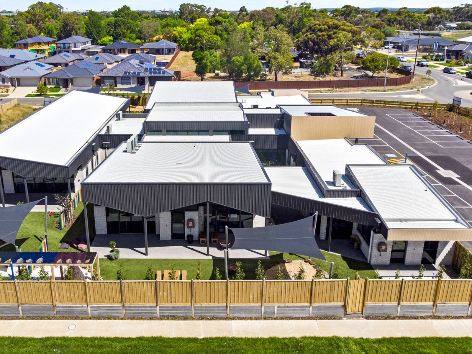 This project located in the Manzeene estate in Lara, Geelong, not only operates as a childcare centre but also as a community hub, hosting inclusive community events that add to the manzeene estates close knit community feel. Constructed on a 4,300m2 site, the centre has room to accommodate 120 children and feature a full commercial kitchen and architecturally designed outdoor spaces. The building boasts a grand scale façade clad in a striking mix aliwood, colorbond and brick making it a focal point of the estate.